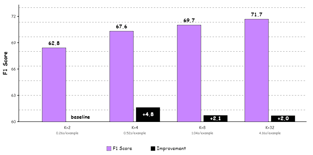 The recommended configuration: K=4 offers optimal performance-cost trade-off, delivering 67.6 F1 with 0.52s per example on H100 GPUs. Beyond K=4, marginal gains diminish rapidly while computational costs scale linearly.